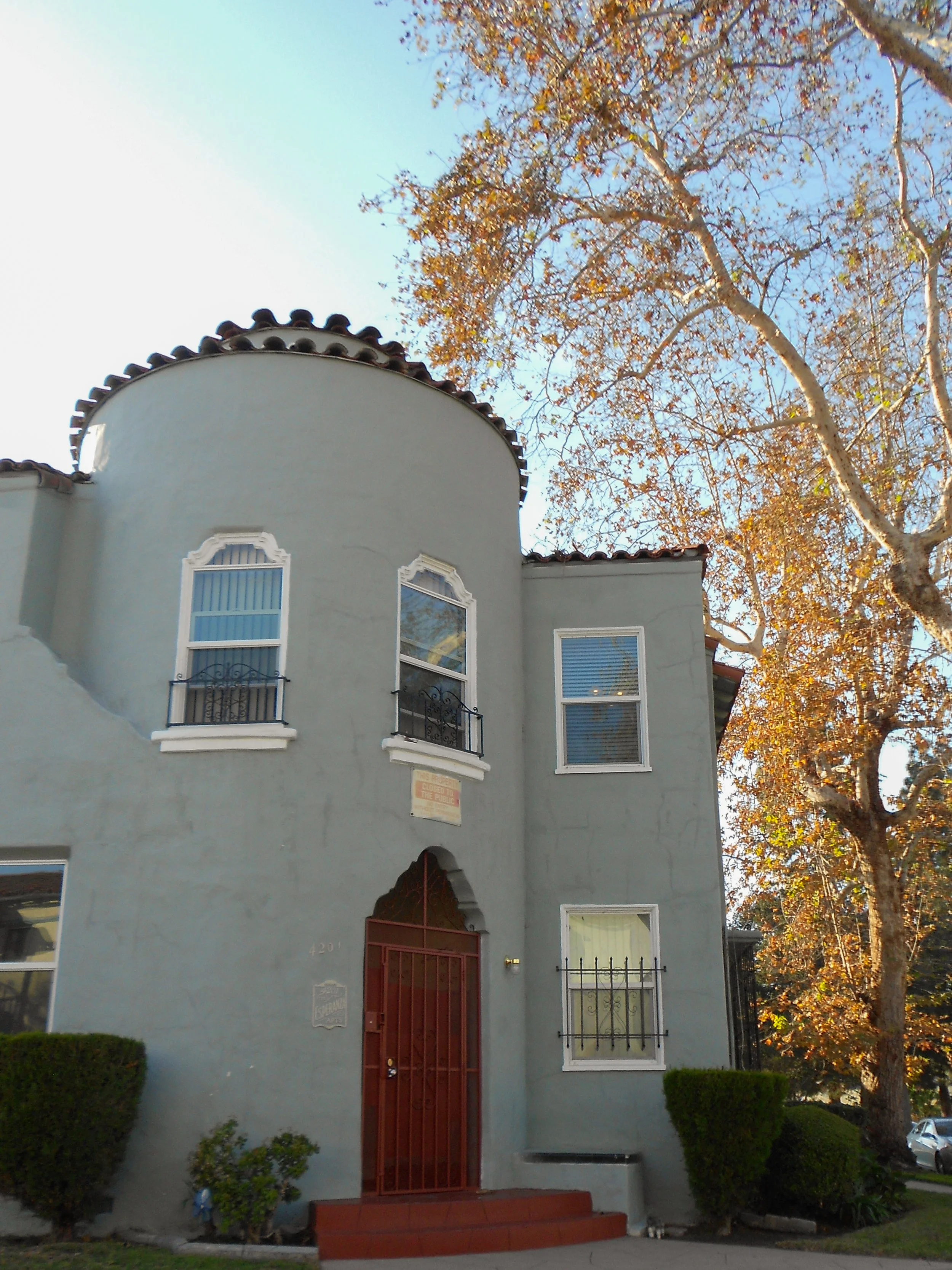 This home, located a couple of blocks down from the entrance to La Fayette Square, combines Spanish Colonial Revival architecture with Minimal Traditional. It’s Spanish-style roofs are similar to lots of others within this HPOZ, but it’s distinct orange wash makes it stand out from the rest.